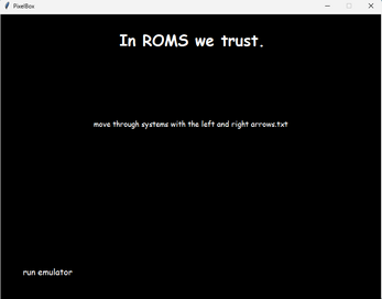 upon opening PixelBox, you will see a blackscreen with a cute lil text that tells you how to move through systems, each system lists what roms you have put in its folder and lets you play by just clicking the rom :)